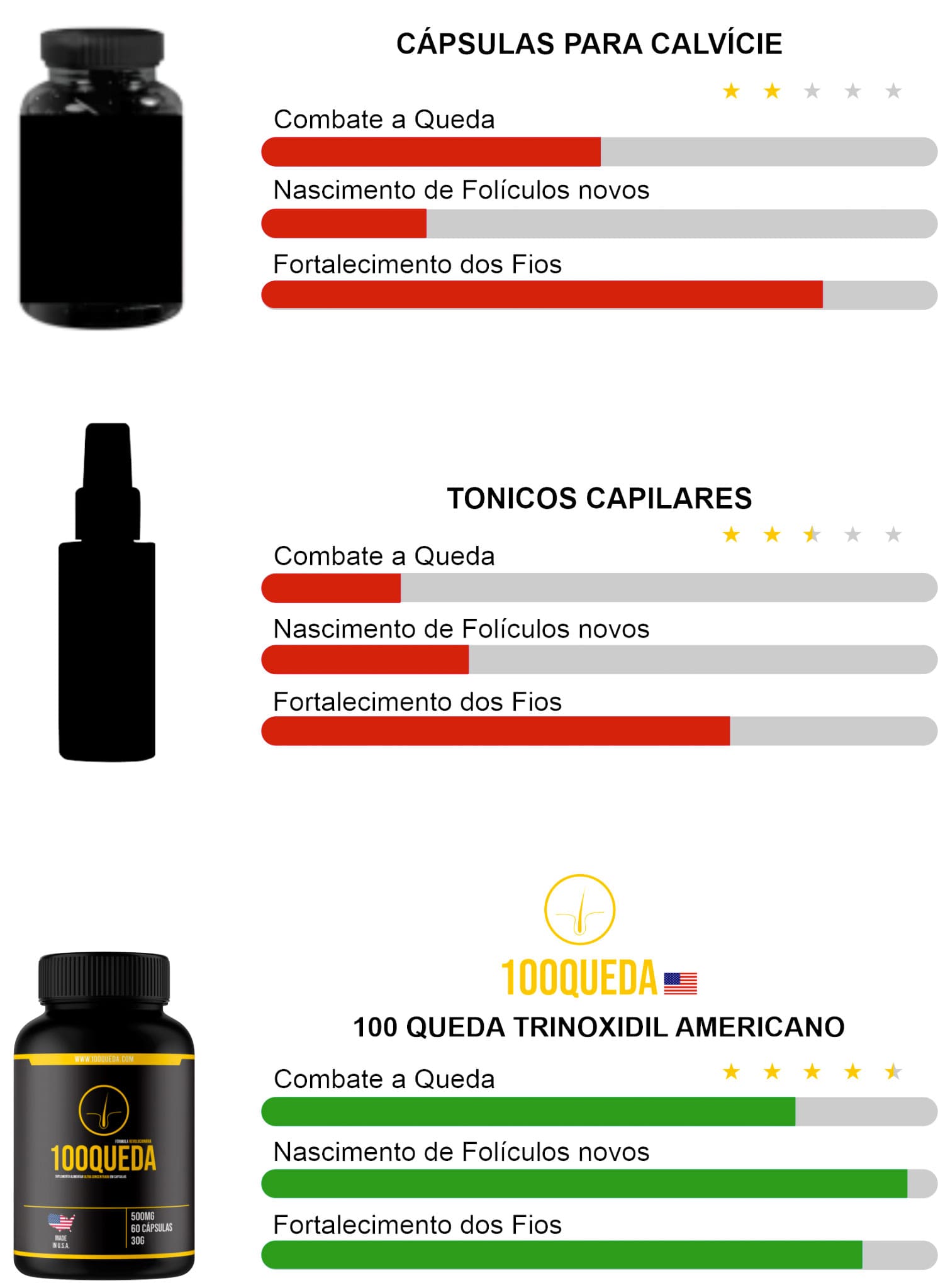 Trinoxidil Americano: O minoxidil é uma substância ativa que estimula o crescimento capilar, já que aumenta o calibre dos vasos sanguíneos, melhorando a circulação sanguínea no local, e prolonga a fase anágena, que é a fase de nascimento e crescimento do cabelo